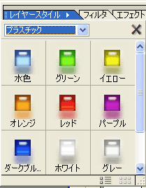 好きなものを選んで、クリックすると、効果が適用されます。 スタイルを他のものにしたり、適用をやめたいときは、レイヤースタイルパレット右上の×をクリックすればリセットされます。 レイヤーパレットを見ると、レイヤースタイルを使ったレイヤーにfのマークが付きます。 |