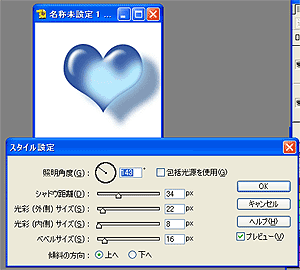 このfのマークをダブルクリックすると、スタイル設定画面が出ます。 ここで、いろいろ設定を変えることができます。 照明角度、シャドウ距離、ベベルサイズを変えてみました。 (もちろん、ここの設定を変えなくても良いです。) こんな感じで、いろいろなレイヤースタイルを使ってみてください。 |