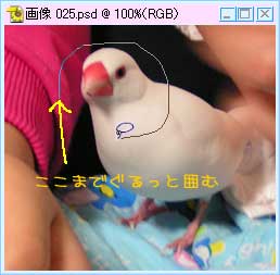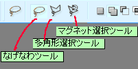 ・なげなわツール 自由な形に選択できます。 クリックしたままでぐるっと選択したいところを囲って、最後に重ねると、選択範囲ができます。 手書きで選択できるわけ。 |