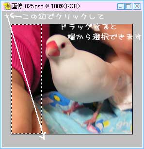 画像が背景レイヤーだったら、レイヤーパレットをダブルクリックしてレイヤー0に変えておきます。 はじめに、長方形の選択ツールで削れる部分は削ってしまいます。 角からキレイに選択したい時は、画像よりはみ出た所から選択を始めると良いです。 普通キャンバスは、画像とぴったり同じサイズですが、キャンバスの角にカーソルを持っていって、キャンバスを広げておくと、作業がやりやすいのでお勧め。 はみ出た所から選択を始めるのは、キャンバスの余白(左の画像のグレーの部分)が無いと、できないんですよ〜。 |