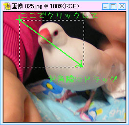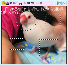 長方形や楕円形に選択範囲を作ります。 選択したいところの角でクリックして、そのまま斜めにドラッグすると、範囲を作ることができます。 |