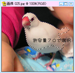 許容量を変えると 許容量10だと、本当によく似た色の所しか選択されてません。 許容量70だと、灰色の濃淡がある部分もある程度選択できてるのが分かると思います。 |