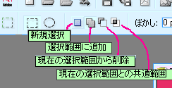 現在の選択範囲との共通範囲: カーソルは 先に作った選択範囲と、後から作った選択範囲の重なった部分のみ選択範囲となります。 例えば、先に四角い選択範囲を作って、コレをクリックして丸い選択範囲を重なるように選びます。 手を離すと、重なった部分だけが残ります。 |