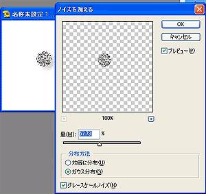 上のレイヤーに描いた丸を自動選択しておきます。 上レイヤーにフィルタ→ノイズ→ノイズを加えるで、ガウス配布、グレースケールノイズにします。 量はいろいろ試して、ちょうどいいのを見つけてください。 |