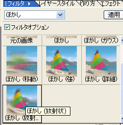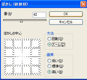 フィルタ→ぼかし→ぼかし(放射状)を適用。 ズームにして、量をちょっと大目にしてみて。 真ん中に向かって、線状になります。 これも、適量はいろいろやってみてください。少なすぎても多すぎても、毛玉っぽくなります; |