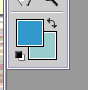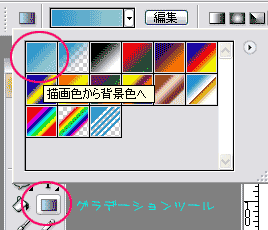 グラデーションをかけます。 描画色と背景色を選んでおきます。 同系色の濃淡が私は綺麗なので好きです(どうでも良いですが;) グラデーションツールをクリックし、初期設定の「描画色から背景色へ」というのを選びます。 初期設定になってなかったら、グラデーションのリストの横の、右向き三角をクリックして、初期設定を選んでください。 といっても、どんなのでも好きなので構いません。 |