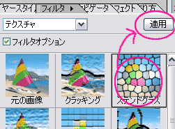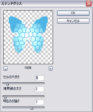 Ctrl+Dで選択を解除し、フィルタ→テクスチャ→ステンドグラスを適用。 |
